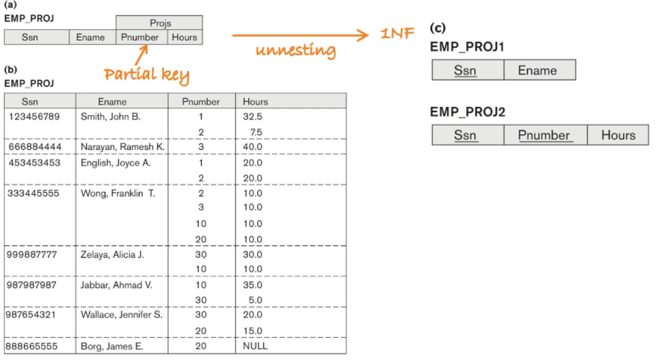 (a)의 EMP_PROJ는 복합 속성을 갖고 있다. 따라서 이를 원자값을 갖도록 테이블을 변경해줘야 한다.