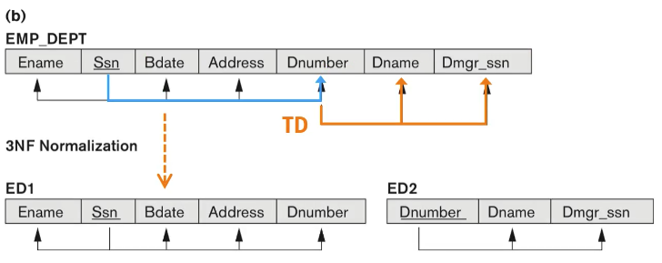 위의 그림에서는 Ssn -> Dnumber이고 Dnumber -> Dname 이기 때문에 Ssn -> Dnumber이다.
