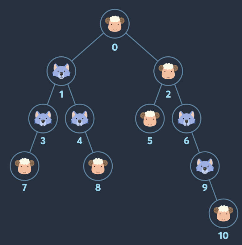 - info[i]는 i번 노드에 있는 양 또는 늑대를 나타냅니다.