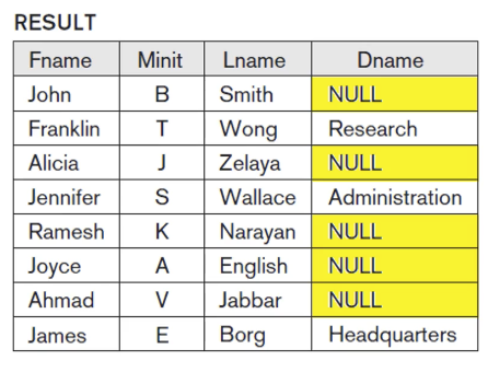 FROM EMPLOYEE LEFT OUTER JOIN DEPARTMENT ON Ssn=Mgr_ssn;