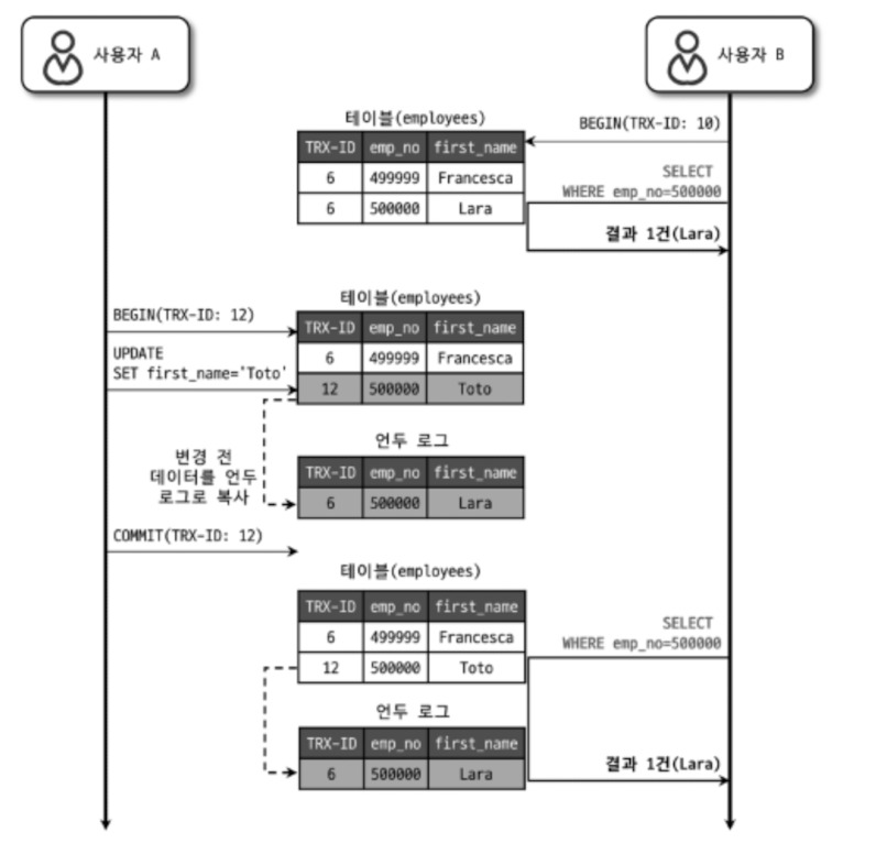 만약 사용자 B 가 변경된 내요이 커밋되기 전에 500000번 레코드를 조회한다면 이때는 언두 로그에 백업된 레코드인 'Lara' 를 조회한다.
